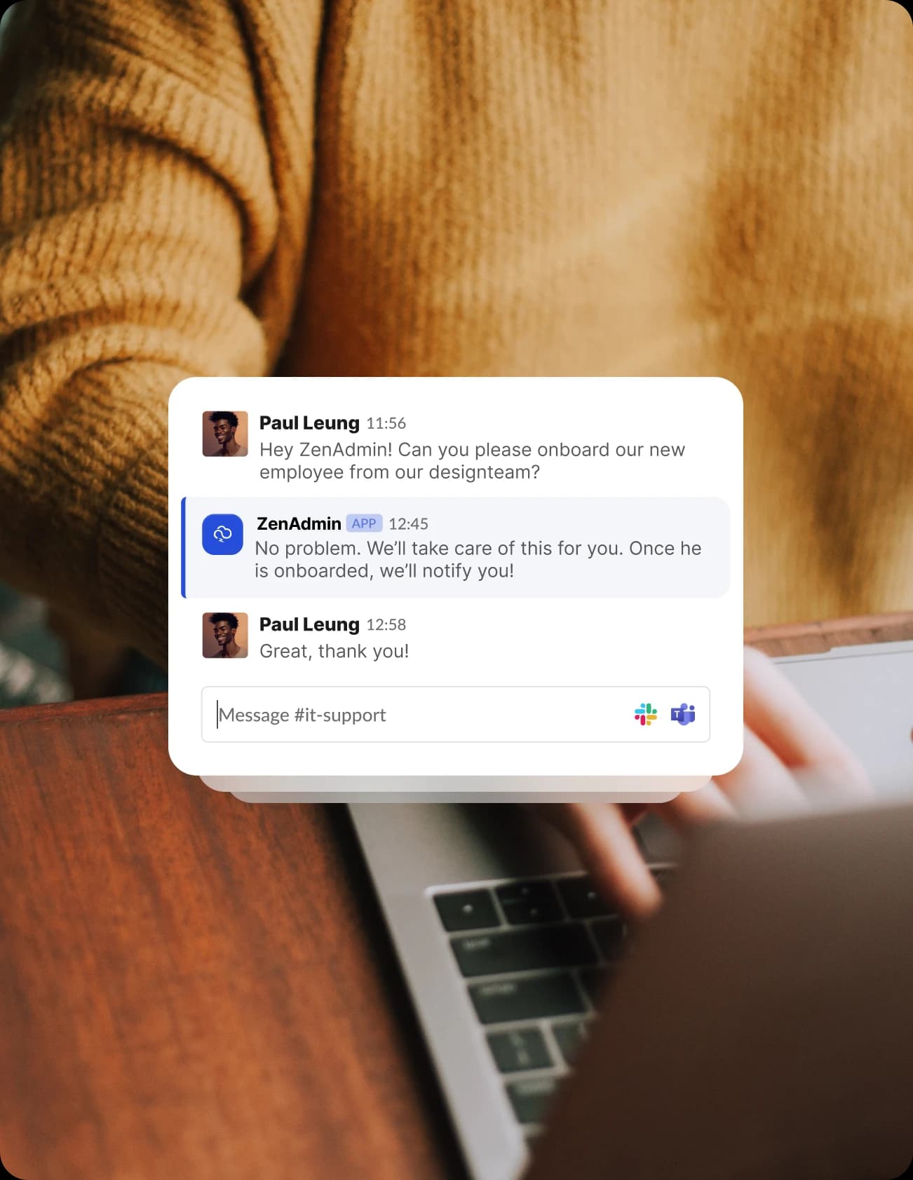 Eliminate tickets and ad-hoc messages by offering modern self-service workflows. Let employees request a new software access with a single click, directly in Slack. Keep them updated about every step until the account is set up and ready to go.